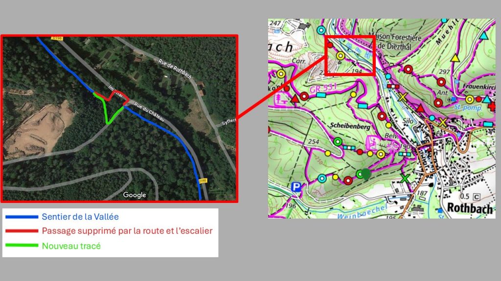 En venant de Rothbach, il faudra monter sur la gauche la route de la carrière sur 30m puis tourner à droite en contournant le bassin de rétention afin de rejoindre l’ancien tracé au-dessus de l’ancien escalier.